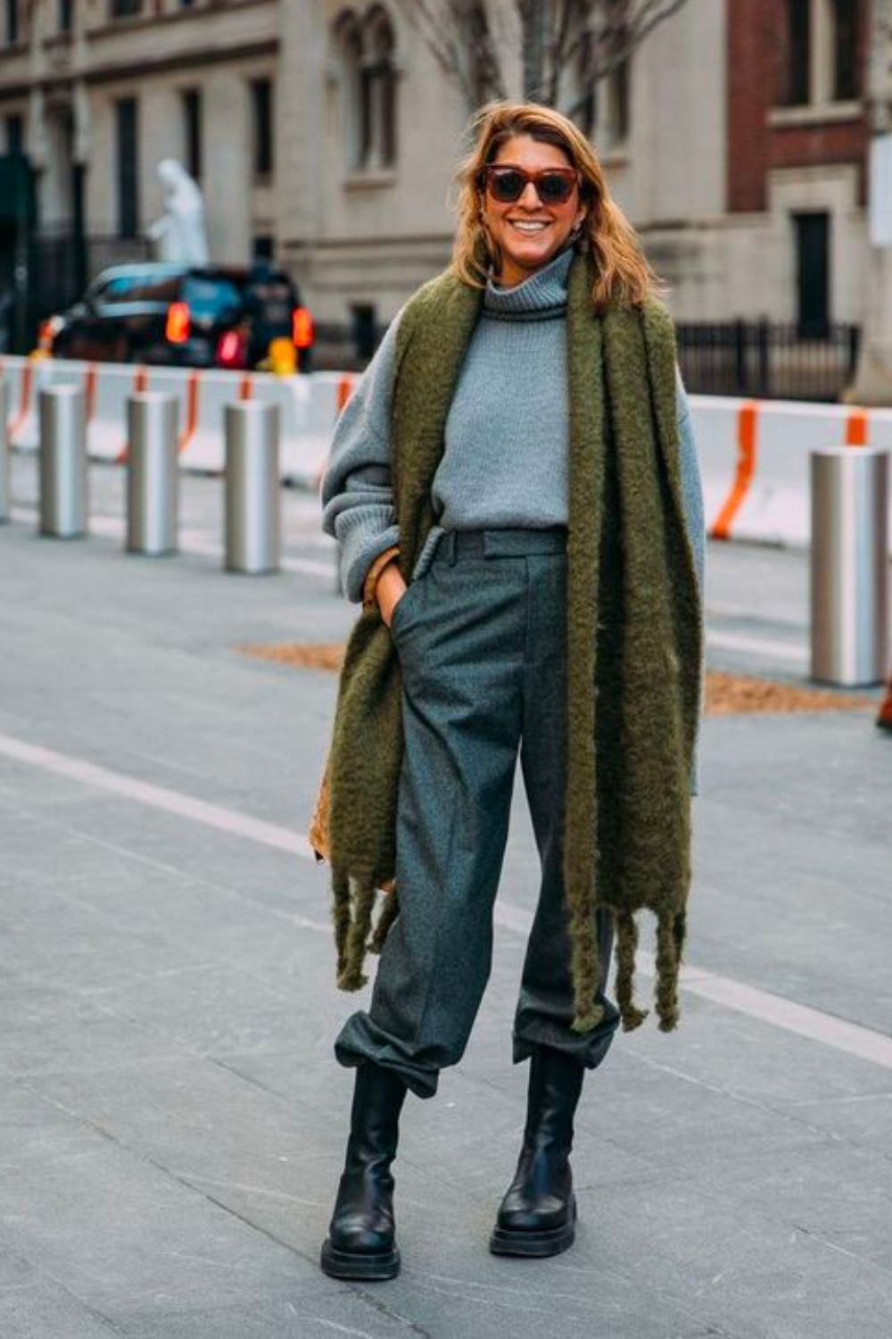 Lauren Santo Domingo wearing tailored pants and draped knitwear